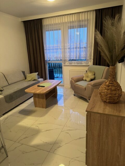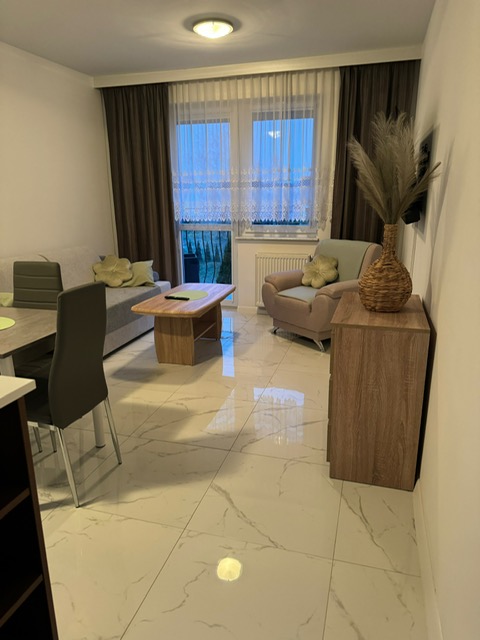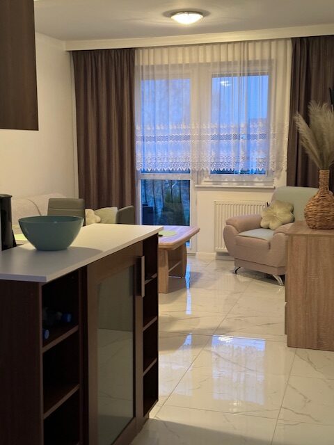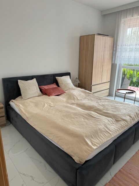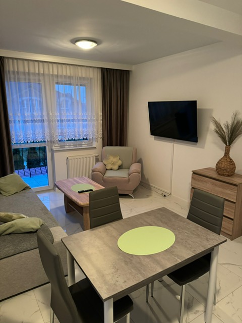 Apartament typu studio składa się z przestronnego salonu, oddzielnej sypialni oraz dwóch łazienek z prysznicem i bezpłatnym zestawem kosmetyków. W pełni wyposażona kuchnia oferuje lodówkę, przybory kuchenne, kuchenkę indukcyjną oraz toster. Goście mają również do dyspozycji balkon, zestaw do parzenia kawy i herbaty, wygodną część wypoczynkową oraz telewizor z płaskim ekranem. W apartamencie znajdują się dwa łóżka: rozkładana sofa o wymiarach 140×200 cm oraz duże łóżko w osobnej sypialni, zapewniające komfortowy sen. To doskonała przestrzeń na relaks i odpoczynek.