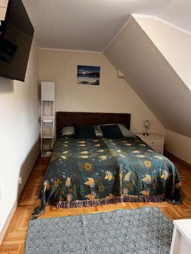 W skład apartamentu wchodzi sypialnia, w którym znajduje się wygodne podwójne łóżko, zapewniające doskonały sen i relaks. Dodatkowo, w pokoju znajdziesz telewizor, abyś mógł cieszyć się ulubionymi programami i filmami w komfortowej atmosferze.